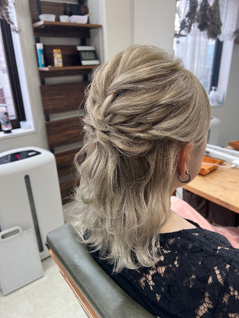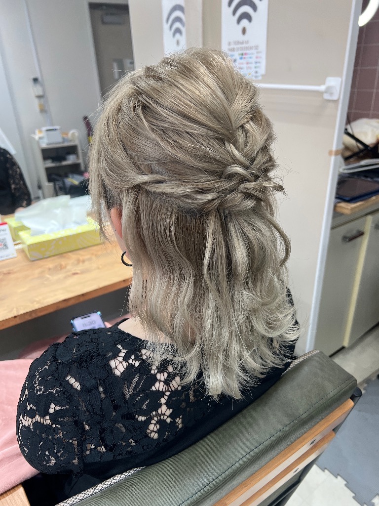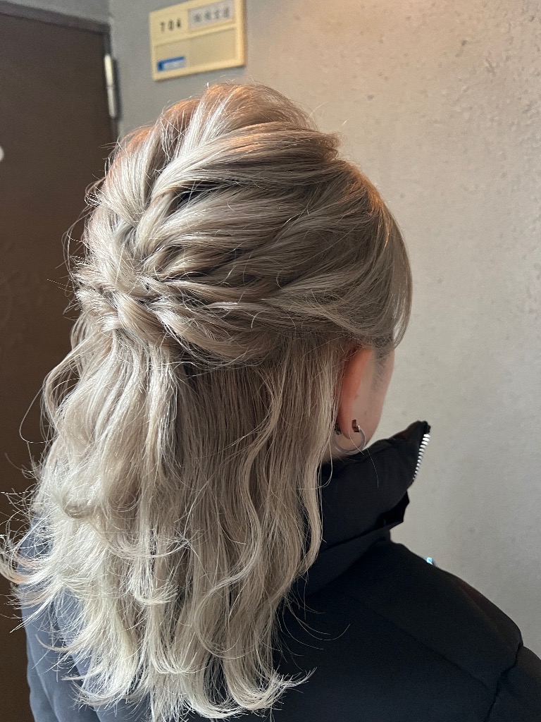 大阪ヘアセットサロン、都島区ヘアセットでお探しの方、大阪京橋駅近セットサロン「ヘアセット専門店703」へ是非!!本日はハイトーンのキレイな髪色を余す事なく活かしたハーフアップ✨✨波巻きの曲線がとても可愛く素敵💓暗い髪色も艶感ある仕上がりでまた違った良さを感じて頂けます!良いな、と思って頂きましたら一度お試し下さい^_^全く同じでなくてもお客様に合わせたスタイリングを致します!
