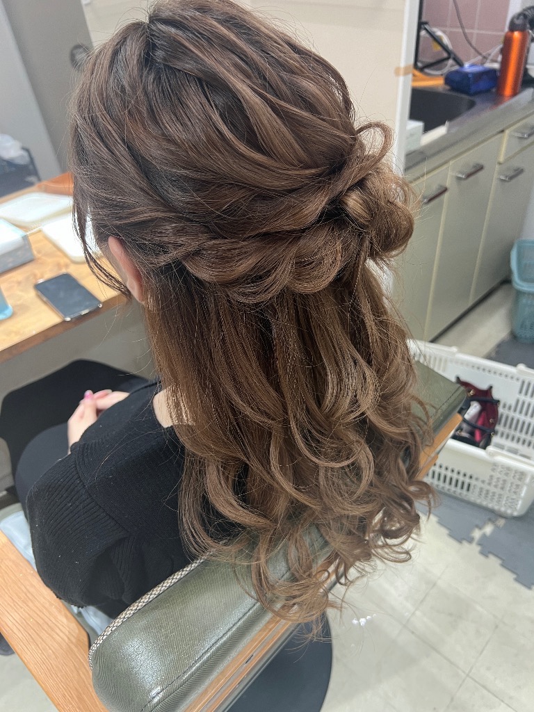 お団子ヘアが強調しすぎないハーフアップです。綺麗に引き出した毛束のリッジが綺麗な陰影になって、ドレスにピッタリな印象を与えます。アクセサリー無しでも、お団子部分のデザインが程よい主張になり、素敵に見えます!当店にお越し頂く際の荷物も軽くて、便利なスタイルです!是非、一度お試しください☺️