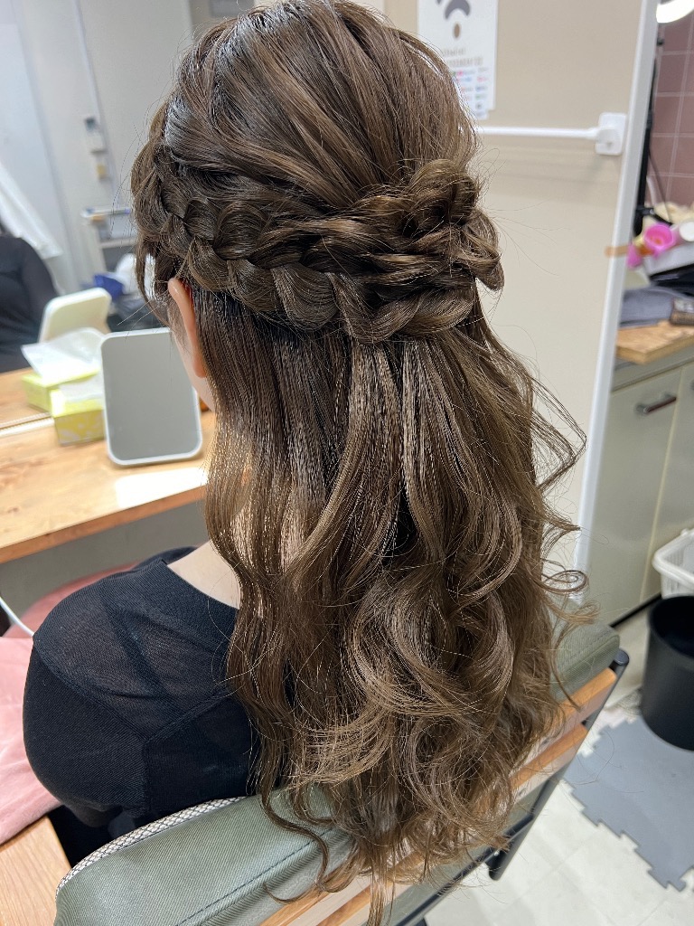 結婚式にはもちろん、卒業式やイベント事にも人気な編み込みハーフアップ✨お好みのアクセサリーで印象も大きく変わります♪今回の巻きはコテ巻き波ウェーブ✨お店によっては波巻きは別料金になるところもあるそうですが、都島区セットサロン「ヘアセット専門店703」は基本料金内で出来ますので、お得かも知れませんね!!ヘアセットサロンで迷ってる方は是非一度、当店をお試し下さい!