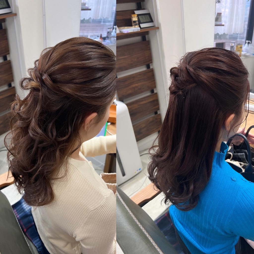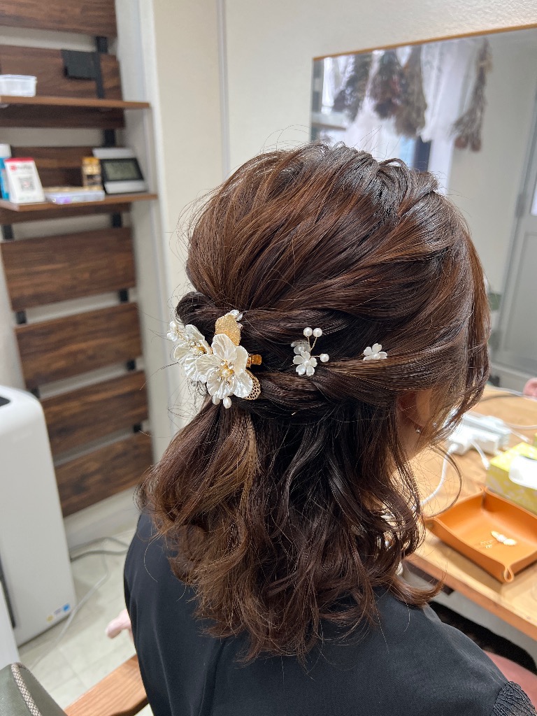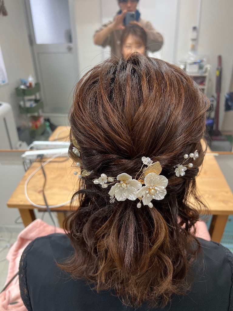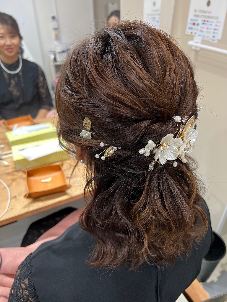華やかなハーフアップ✨✨25ミリと19ミリのコテを使って作りました♪髪の毛の中側がボリュームダウンの為に、結構すいてあったので、普通のコテ巻きだとスカスカになりがちになります🤔こういう時は波ウェーブがオススメですね!ボリュームが欲しいところの毛束を全部波ウェーブにして、全体のバランスを整えられますので😉お客様ご持参のアクセサリーも付けて華やかハーフアップの出来上がり💞都島区ヘアセットサロンをお探しの方は、是非当店へ👍